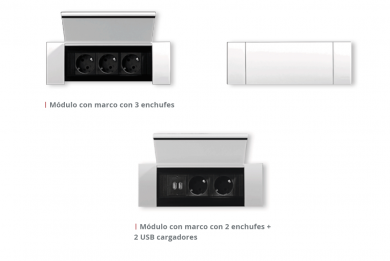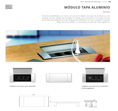 El Módulo con tapa de aluminio es la evolución del Módulo con marco, al cual se le añade una tapa de aluminio con un acabado de alta calidad que protege el módulo de la encimera y lo remata de una forma discreta y elegante a la vez. Al Igual que el Módulo con marco, también se puede elegir entre 3 enchufes, o 2 enchufes y 2 tomas de USB-cargadores.