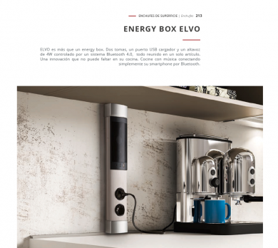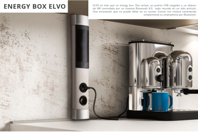 ELVO es más que un energy box. Dos tomas, un puerto USB cargador y un altavoz de 4W controlado por un sistema Bluetooth 4.0, todo reunido en un solo artículo. Una innovación que no puede faltar en su cocina. Cocine con música conectando simplemente su smartphone por Bluetooth.