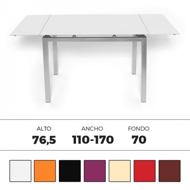 Mesa extensible fabricada con estructura metálica lacada en cromo mate y tapa de cristal templado en color a elegir. Ideal para cocinas o comedores.