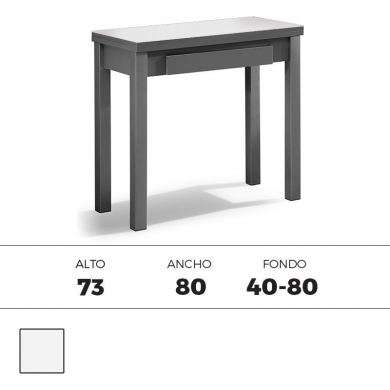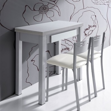 Mesa de cocina fabricada con estructura metálica en cromo mate de alta calidad, tapa de cristal templado y ala extensible de madera lacada a juego.