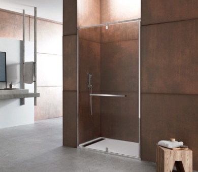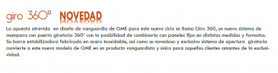 La apuesta atrevida en diseño de vanguardia de GME para este nuevo ciclo se llama Giro 360. Un nuevo sistema de mampara con puerta giratoria 360º. Dicho modelo con la posibilidad de combinarla con paneles fijos en distintas medidas y formatos. Su barra estabilizadora fabricada en acero inoxidable. Así como, su novedoso y exclusivo sistema de apertura giratoria convierte a este nuevo modelo de GME en un producto vanguardista y único para aquellos clientes amantes de la exclusividad.