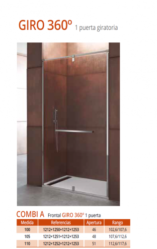 Mampara GIRO 360º puerta giratoria. Fabricada con cristales de 6/8 mm de grosor. Giro está disponible en formatos puerta giratoria, puerta giratoria más fijo y puerta giratoria más 2 fijos. Posibilidad de combinar con lateral fijo STD 8 mm cualquiera de los formatos anteriormente comentados.