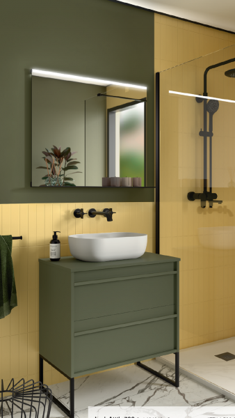 El conjunto incluye un lavabo de porcelana extraplano, un espejo disponible en anchos de 60, 80 y 100 cm con 80 cm de altura, y un aplique con iluminación LED, aportando funcionalidad y una iluminación óptima para el uso diario.