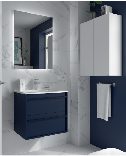 Está disponible en medidas de 60, 80, 100 y 120 cm (en esta última opción con dos muebles) y en 140 cm con dos muebles, adaptándose a diferentes tamaños y necesidades de baño. Cuenta con un fondo de 45 cm y una altura de 54 cm, ideales para una distribución equilibrada.