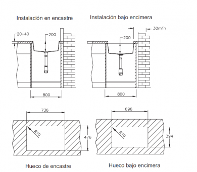 Montaje estándar en mueble de 80 cm en encastre y bajo encimera.
