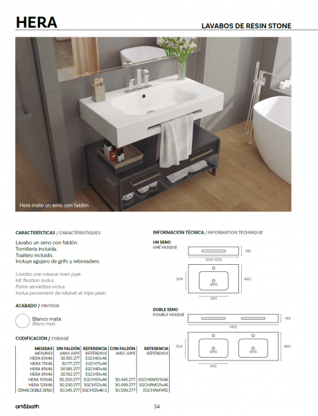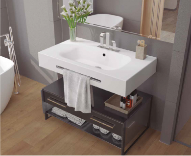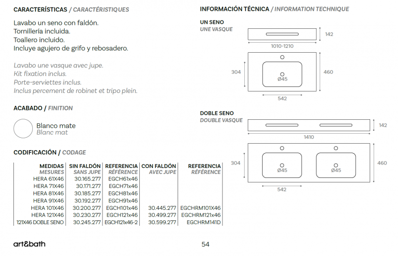 Diseñada para instalación suspendida o sobre mueble, incluye faldón, toallero y sistema de sujeción, ofreciendo una solución completa y funcional. Incorpora agujero para grifo y rebosadero, lista para su instalación.