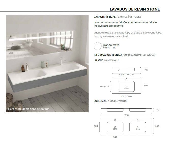 La encimera de baño Hera con faldón mate está fabricada en Resin Stone, un material resistente y de alta calidad que combina diseño moderno y durabilidad. Su acabado en blanco mate aporta elegancia y fácil integración en cualquier estilo de baño.