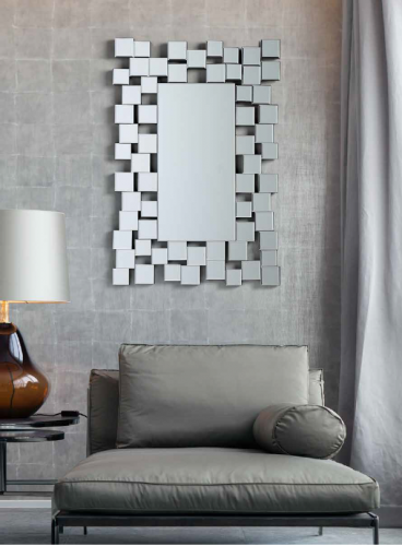 Formado por un espejo central y marco perimetral de pequeños rectángulos metálicos con bisel
