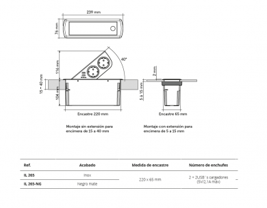 IL 265 Inox220 x 65 mm 2 + 2USB´s cargadores(5V/2,1A máx)