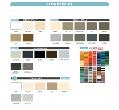 Gris Cielo, Pizarra, negro, Wengüe. Gris Metalizado, Negro Metálizado, Gris Titanio,