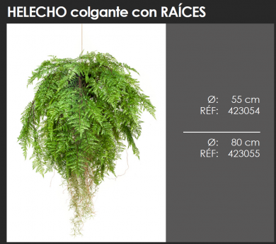 HELECHO colgante artificial con raíces que cuelgan dándole un alto realismo. Las hojas de un