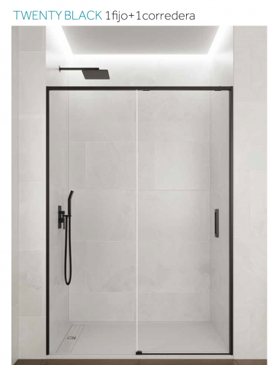 Mampara de ducha frontal con un fijo y una corredera. Modelo Twenty Black, está fabricada con