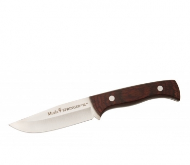 empuñadura de madera prensada coral e incluye funda de cuero marron.