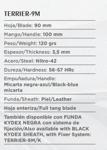 TERRIER-9M PIEL Cuchillo Muela Terrier 9G, hoja de acero Nitro-42, todo una pieza