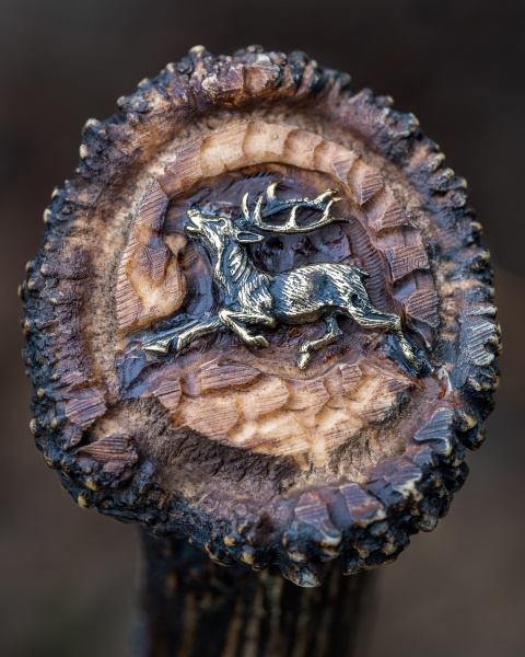 Este cuchillo destaca por su puño de asta de ciervo tallado, decorado con una escena de jabalí, acompañado de roseta y defensa de latón e inoxidable, combinando tradición, estética y funcionalidad.