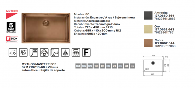 recubrimiento de color de alta resistencia, instalación a ras/bajo encimera, incluye