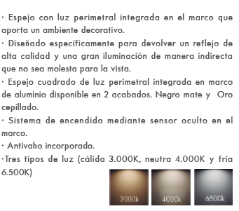 Incorpora anti-vaho y sistema de encendido mediante sensor oculto en el marco.