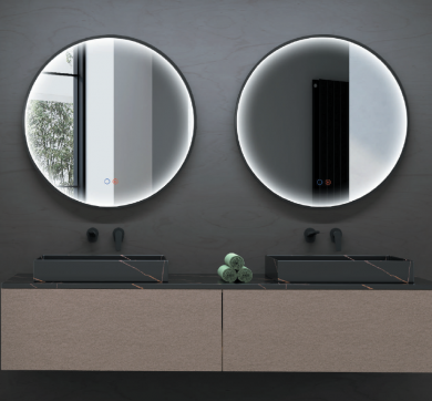 Espejo redondo con luz perimetral integrada en el marco de aluminio en acabado negro mate que aporta