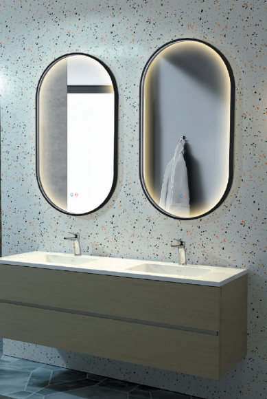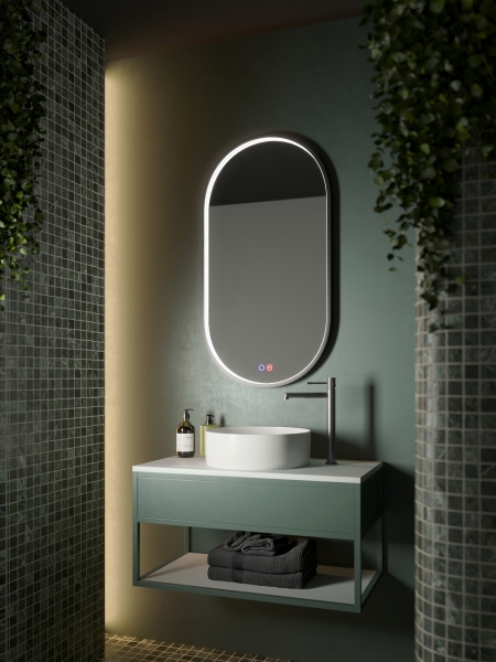 Espejo elíptico con luz perimetral integrada en el marco de aluminio acabados negro mate que aporta un