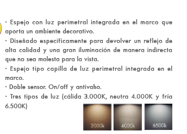 anti-vaho. Disponible en tres tipos de luz (3.000k cálida, 4.000k neutra y 6.500k fría).