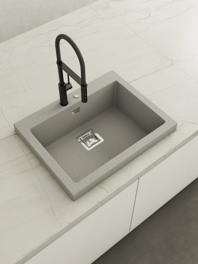 .Fregadero sobre encimera, fabricado en Helka, es un material sintético, con propiedades antirrayado, antinflamable,resistente agentes quimicos y antibacteriano.