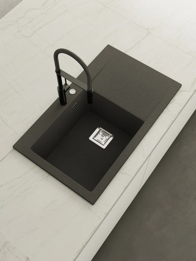 Fregadero sobre encimera, fabricado en Helka, es un material sintético, con propiedades antirrayado, antinflamable,resistente agentes quimicos y antibacteriano.