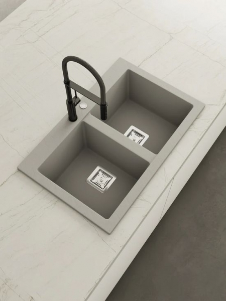Fregadero sobre encimera, fabricado en Helka, es un material sintético, con propiedades antirrayado, antinflamable,resistente agentes quimicos y antibacteriano.
