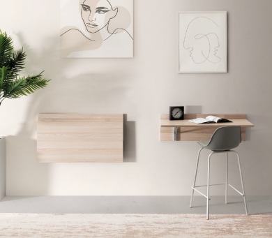 Mesa anclada en pared, en forma de estanteria, plegable