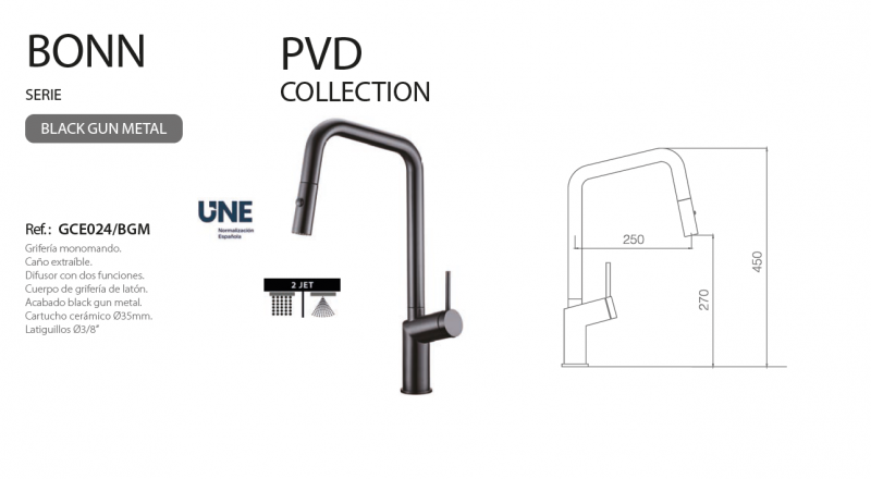 Grifería de cocina monomando extraíble Black Gun Metal serie Bonn