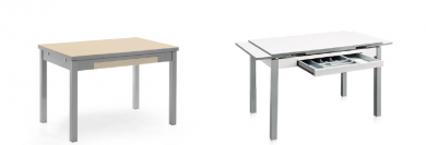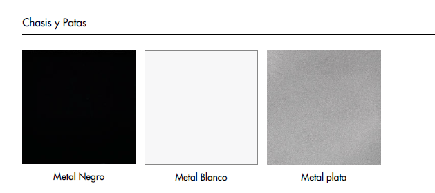 Es una mesa rectangular con tapa laminada o cristal, chasis laminado y patas metálicas.