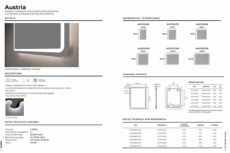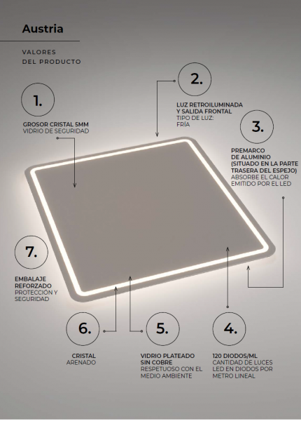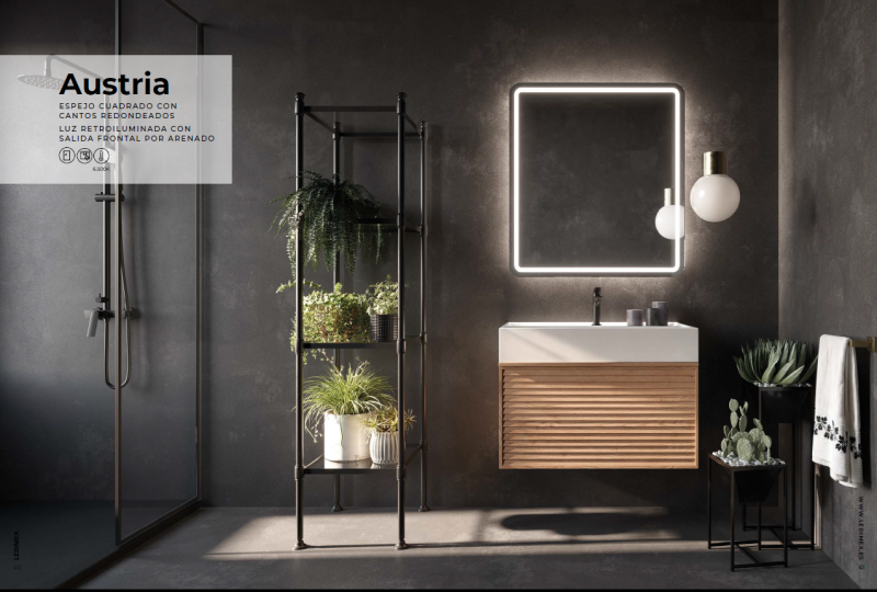 Espejo cuadrado con cantos redondeados y luz frontal fría.