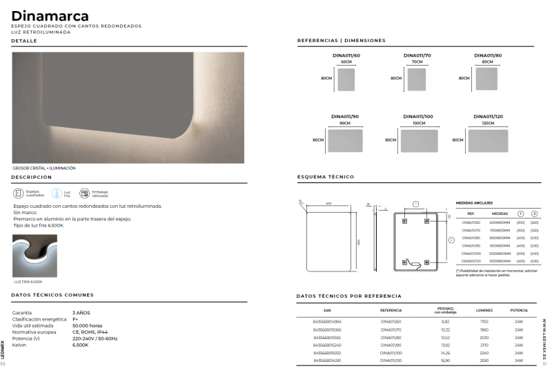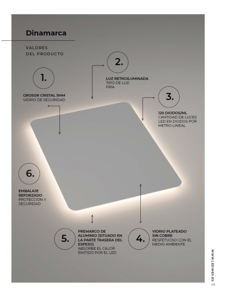 Espejo cuadrado con cantos redondeados con luz retroiluminada.