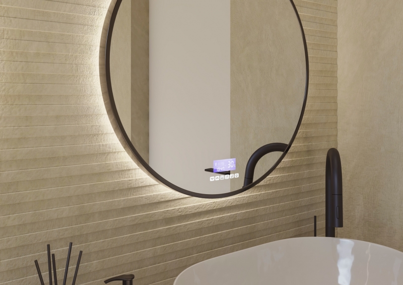 Espejo con marco metálico de 15x20mm que enrasa un vidrio con luz ambiental