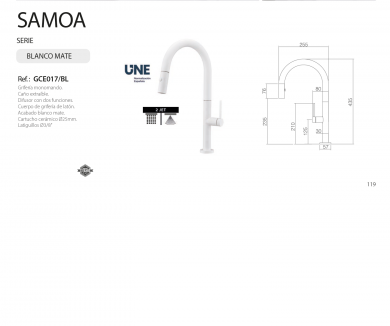Grifería de cocina monomando extraíble blanco mate serie Samoa