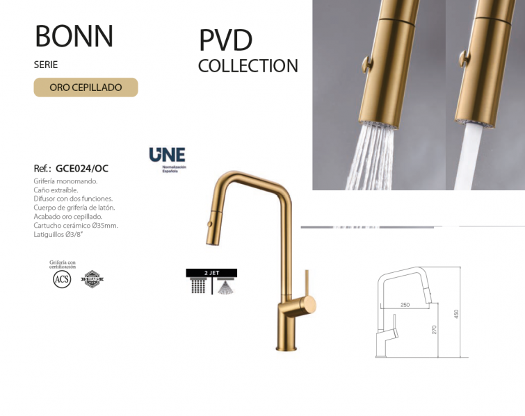 Grifería de cocina monomando extraíble oro cepillado serie Bonn