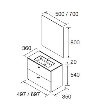 Cuenta con 2 cajones equipados con guías Hettich de extracción total, que garantizan un deslizamiento suave . El conjunto completo incluye Muble+ lavabo+ Espejo, aunque tambíen se pude comprar solo el mueble mas lavabo