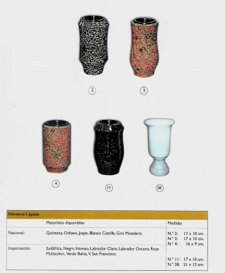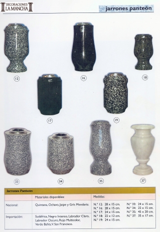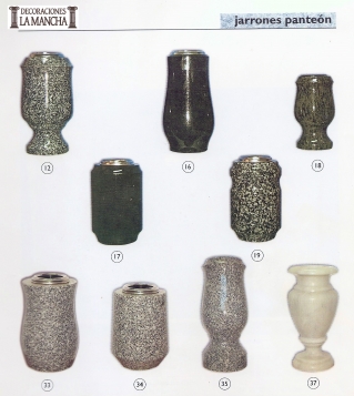 Ofrecemos una hermosa selección de jarrones funerarios, disponibles en cerámica, mármol, metal y piedra. Estos jarrones han sido diseñados para complementar perfectamente las tumbas y los monumentos funerarios, proporcionando un espacio para flores frescas o artificiales. Los jarrones de La Mancha son conocidos por su artesanía de calidad, con detalles finos que reflejan la dedicación de nuestros artesanos. Son ideales para añadir un toque de serenidad y belleza al lugar de descanso.