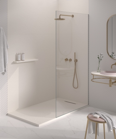 Utiliza nuestro plato CALIZA, con rejilla del mismo material y sin cortes, para una sensación de amplitud mayor.